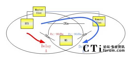 在GRRU安裝過(guò)程中會(huì)遇到信源基站和光纖直放站信號(hào)重疊的問(wèn)題,就是由于多徑傳播引起的時(shí)間色散產(chǎn)生同頻干擾。對(duì)于上圖所示,我們假設(shè)基站到戶用之間的信號(hào)質(zhì)量較好,能夠接收到正常的基站信號(hào),但是此時(shí)如果引入一個(gè)GRRU,此時(shí)的時(shí)延差為delayB-delayA=(5Km的空間時(shí)延+10Km光纜時(shí)延+設(shè)備時(shí)延)-5Km的空間時(shí)延=10Km光纜時(shí)延+設(shè)備時(shí)延=2Km×4.76us/Km+10μs=19.52 us>15μs(4TA)。此時(shí)直放站的信號(hào)就只能判斷為同頻干擾信號(hào),必須小于同頻干擾保護(hù)比9dB。