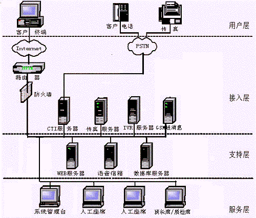 CTI服務器、IVR/FAX服務器、人工座席、管理工作站(計費、統(tǒng)計、系統(tǒng)管理、網(wǎng)絡管理)、數(shù)據(jù)庫服務器、WWW服務器、網(wǎng)絡系統(tǒng)等,其網(wǎng)絡結構圖如下:
