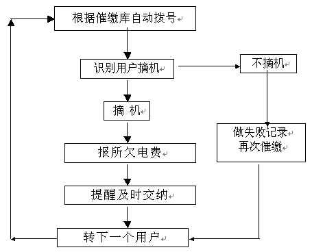 。。催費工作是由指定的欠費數據文件(或欠費數據庫)中提取用戶電話號碼和欠費金額,自動順序向各欠費用戶撥號,撥通后自動播放催費通知并通報欠費金額數。系統(tǒng)自動統(tǒng)計通話結果,系統(tǒng)對未應答用戶會自動重復多次撥叫。