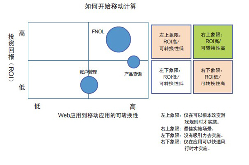 建議考察兩個(gè)基本維度:(1)第一個(gè)移動(dòng)項(xiàng)目的總投資回報(bào)(ROI)和價(jià)值主張是什么?(2)現(xiàn)有的Web應(yīng)用如何通過(guò)相對(duì)較少的努力就可以轉(zhuǎn)變成移動(dòng)應(yīng)用?在下面的圖表中這兩個(gè)維度被標(biāo)為X軸和Y軸。氣泡的大小代表投入的大小。很顯然,右上方的象限是容易摘取的果子。您選擇哪個(gè)氣泡關(guān)鍵在于您對(duì)風(fēng)險(xiǎn)的偏好以及在市場(chǎng)中成為領(lǐng)先者的渴望。