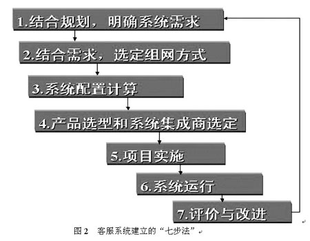 在規(guī)劃了呼叫中心戰(zhàn)略、客服組織架構(gòu)、客服流程與客服績(jī)效考評(píng)之后,呼叫中心系統(tǒng)的建設(shè)就有了戰(zhàn)略層面的規(guī)劃和運(yùn)營(yíng)管理層面的指導(dǎo),而對(duì)戰(zhàn)略管理和運(yùn)營(yíng)管理方面的支持則有賴于客服系統(tǒng)的建立。在戰(zhàn)略管理和運(yùn)營(yíng)管理指導(dǎo)下的客服系統(tǒng)如何具體建立呢?下面分七個(gè)步驟來(lái)分別說(shuō)明: