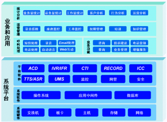 從呼叫中心的建設(shè)角度分析,系統(tǒng)將分為系統(tǒng)平臺(tái)和業(yè)務(wù)應(yīng)用2大部分: