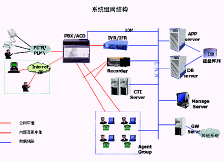 針對(duì)大型呼叫中心需求,可以推薦采用傳統(tǒng)PBX平臺(tái)呼叫中心解決方案;鞠到y(tǒng)組網(wǎng)結(jié)構(gòu)如下: