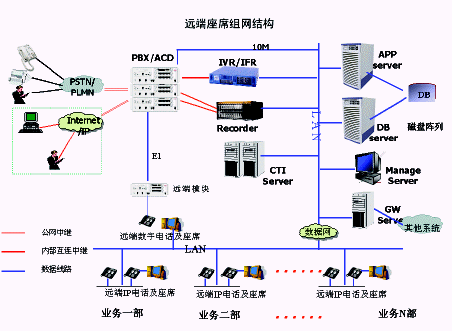 遠(yuǎn)端座席組網(wǎng)方式中,中心點(diǎn)和遠(yuǎn)端座席之間通過(guò)采用數(shù)字中繼(E1)連接的遠(yuǎn)端模塊或采用數(shù)據(jù)網(wǎng)絡(luò)連接的IP電話方式。具體方式如下圖: