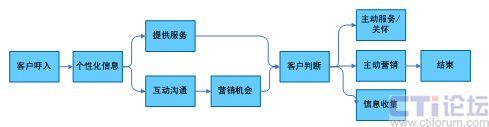 在上面的流程中,將一次客戶接觸,轉(zhuǎn)變?yōu)橐淮稳娴目蛻艋訖C會,通過對客戶信息360度的洞察和客戶的互動溝通,在為客戶提供基本服務(wù)的同時,根據(jù)客戶的基本資料、歷史消費數(shù)據(jù)等,挖掘客戶的隱性需求,從而有選擇的開展客戶關(guān)懷、客戶信息收集、客戶維系、主動營銷活動。下面以一個電信運營商的客戶呼入流程為例,說明在一個以客戶為中心的客戶接觸流程中,坐席代表可以開展的客戶接觸活動(圖4)。