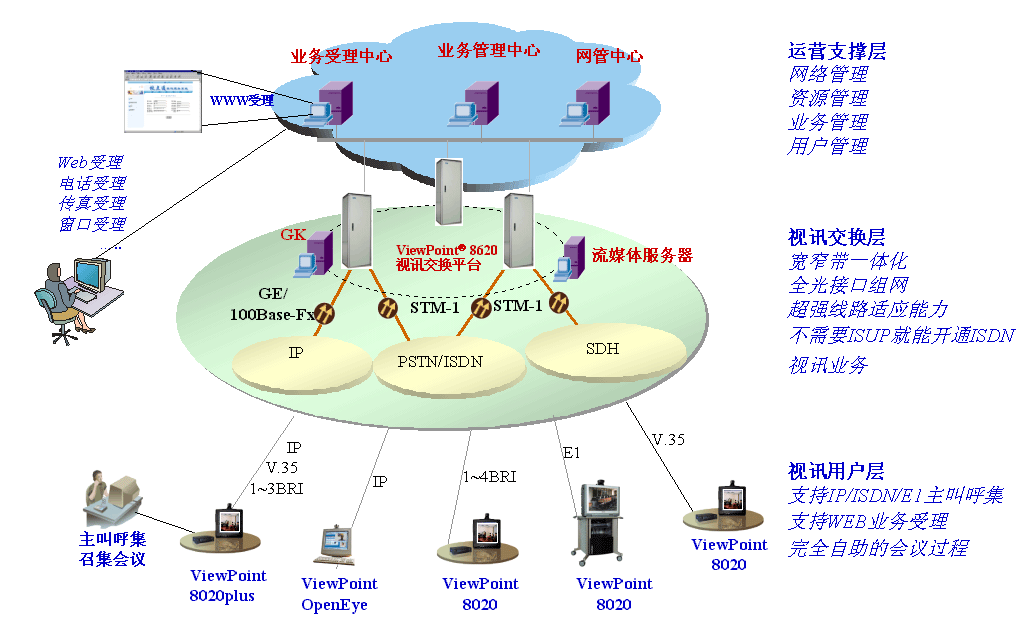 面對公眾視訊業(yè)務發(fā)展的契機,由于基于窄帶H.320的視訊系統(tǒng)較為成熟,而基于IP網(wǎng)的H.323系統(tǒng)被普遍看好,ISDN目前是最方便的公眾視訊系統(tǒng)接入手段,相對于其他接入方式(如E1、DDN、FR、ATM、IP等)使用方便,可方便通過撥號方式與任何聯(lián)網(wǎng)地區(qū)建立會議。ViewPoint 8620視訊交換平臺采用寬窄帶一體化設計,可為各行各業(yè)用戶提供完備的一體化解決方案,不僅能提供大容量ISDN用戶撥號接入,還能提供大容量的E1/V.35/IP方式接入。公眾視訊業(yè)務的發(fā)展,將視訊業(yè)務從單純?yōu)樯贁?shù)特定用戶群提供遠程會議服務,轉(zhuǎn)而面向公眾,為各行各業(yè)提供視訊業(yè)務。