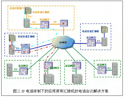 伴隨著IP網(wǎng)的建設(shè)和VoIP電話系統(tǒng)標(biāo)準(zhǔn)的日益完善,許多行業(yè)、部門開始在建設(shè)IP數(shù)據(jù)網(wǎng)的同時(shí),結(jié)合原有電話專網(wǎng)的改造,著手建設(shè)IP電話網(wǎng)絡(luò)。在IP電話網(wǎng)上實(shí)現(xiàn)原有的電話會(huì)議業(yè)務(wù)也就隨之提到日程上來(lái)。華為公司結(jié)合IP電話的特點(diǎn)和保護(hù)用戶已有投資的角度,提出延用電話會(huì)議匯接機(jī)和采用華為專用IP電話會(huì)議控制系統(tǒng)兩套解決方案:
