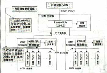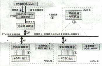 可實(shí)現(xiàn)高效的兩級(jí)組播;诳臻g總線上的組播信元技術(shù)實(shí)現(xiàn),與組播用戶數(shù)無(wú)關(guān),同一節(jié)目即使所有用戶加入該頻道,僅需復(fù)制一份,不用逐個(gè)用戶復(fù)制到每個(gè)用戶端口,極大節(jié)省了背板帶寬,減輕IP上行負(fù)擔(dān)?蓪(shí)現(xiàn)高性能硬件組播轉(zhuǎn)發(fā)。IP上行板采用超大規(guī)模FPGA硬件邏輯處理組播報(bào)文,ADSL板采用空間組播處理硬件芯片自動(dòng)完成向每個(gè)ADSL端口(用戶)的組播復(fù)制,每ADSL端口組播帶寬6M。