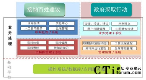 在架構(gòu)設(shè)計上,從電話接入、辦件流程、資料庫管理、信息維護(hù)到報表統(tǒng)計都實現(xiàn)了一體化設(shè)計理念。以業(yè)務(wù)流程設(shè)計為例,針對市民來電中的咨詢類的問題,12345政府熱線將直接由前臺接聽人員利用各部門預(yù)先錄入資料庫中的規(guī)范答案來回答市民的提問;對市民反映、建議、投訴類的來電,則由前臺記錄后轉(zhuǎn)給市信訪辦的后臺工作人員處理。一整套開放性的工作流和穩(wěn)定的技術(shù)后臺支持確保了市民可以在規(guī)定的時間內(nèi)得到政府的權(quán)威處理與回復(fù)。