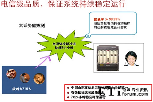 華為聯(lián)絡(luò)中心系統(tǒng)具有高穩(wěn)定性、高可靠性、易擴(kuò)展性和可維護(hù)性。這主要源于華為對電信網(wǎng)絡(luò)現(xiàn)狀與演進(jìn)的理解,源于華為擁有固定、移動(dòng)和IP三個(gè)網(wǎng)絡(luò)方面綜合實(shí)力。華為數(shù)以千計(jì)的核心平臺開發(fā)測試人員,幾十種極端環(huán)境(如超大話務(wù)量、溫差、濕度、鹽堿度、缺氧等),磨礪出的是世界級的高品質(zhì)。麥加朝圣10KM內(nèi)密集200萬移動(dòng)用戶,大部分為國際漫游,整齊劃一的用戶行為,形成連日多波話務(wù)尖峰,網(wǎng)絡(luò)受不均衡沖擊,系統(tǒng)容易雪崩。使用華為方案STC連續(xù)四年征服HAJJ期間話務(wù)高峰,告別系統(tǒng)每逢朝圣就癱瘓歷史。正是繼承了這樣的DNA,我們在某移動(dòng)運(yùn)營商聯(lián)絡(luò)中心系統(tǒng)單點(diǎn)實(shí)測BHCC1200K,每天平均呼叫量為600萬次,一套系統(tǒng)支撐著2000多座席和近8000路IVR。