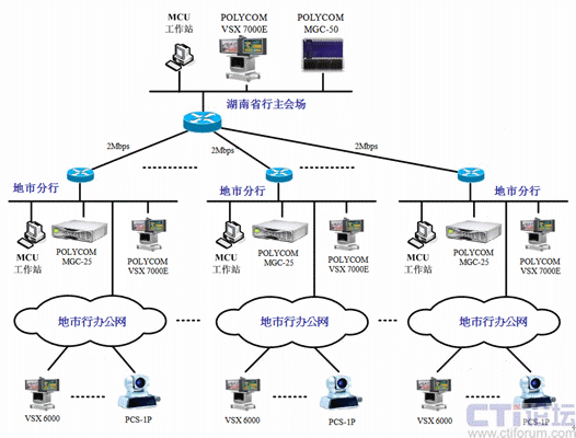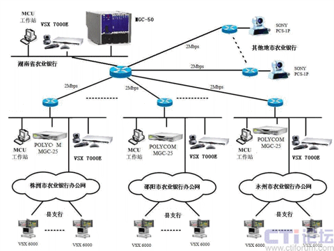 在株洲、邵陽(yáng)和永州市行采用級(jí)聯(lián)的方式來實(shí)現(xiàn)。具體實(shí)現(xiàn)方式為:VSX 7000E則和地市行的MGC-25通訊,并且MGC-25負(fù)責(zé)其縣支行終端的接入,同時(shí)用MGC-50和MGC-25的端口級(jí)聯(lián),采用這種連接方式就可以實(shí)現(xiàn)從省行-地市行-縣支行的三級(jí)網(wǎng)視頻會(huì)議的召開。