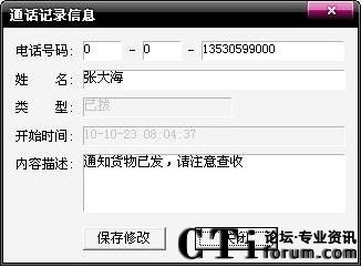 在A8電腦傳真機的電話商務通軟件主界面,雙擊通話記錄中的某個客戶號碼,或選中該號碼點擊下面的通話歷史按鈕,您與該客戶的通話歷史便一覽無余。選中某個記錄,您可以對其進行編輯(添加姓名、備注該次通話的內(nèi)容),刪除,軟件撥出,加入電話簿等操作。