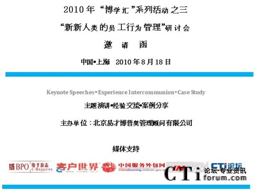 21世紀什么是貴?人才最貴!人才是企業(yè)持續(xù)發(fā)展的唯一生命之源。易才博普奧公司(CTG BPO)作為專業(yè)的人力資源外包專家、服務外包產(chǎn)業(yè)專業(yè)人才租賃供應商,近年來在業(yè)界積累了大量優(yōu)秀的一線人才租賃經(jīng)驗并得到廣泛的業(yè)界好評!2010年伊始,易才博普奧推出了“博學匯”系列客戶交流會活動,旨在搭建一個與行業(yè)精英、業(yè)內(nèi)專家互動交流的平臺,學習、體驗和分享多元文化,促進和推動彼此之間的交流與合作。