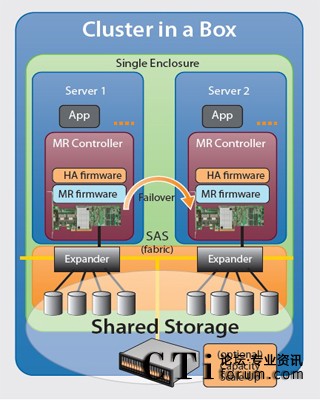 HA-DAS 解決方案,該方案包含一個布置在單一機(jī)箱中的雙服務(wù)器 3U 系統(tǒng),使用 LSI® MegaRAID® 6Gb/s