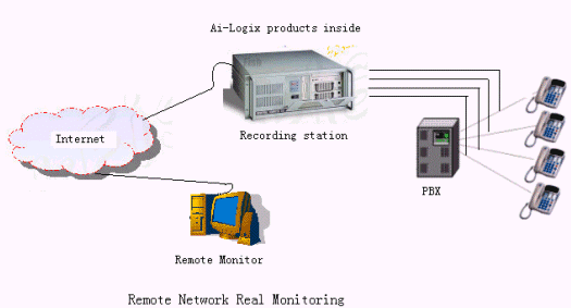 如上圖,在Recording Station 中裝有支持MVIP總線的Ai-Logix系列錄音卡.Recording Station通過(guò)Ai-Logix系列錄音卡搭線在被監(jiān)聽的電話線上,采用高阻錄音技術(shù),取得通話的錄音數(shù)據(jù),再由Internet實(shí)時(shí)傳給Remote Monitor.在遠(yuǎn)端網(wǎng)絡(luò)終端實(shí)現(xiàn)流式電話監(jiān)聽.