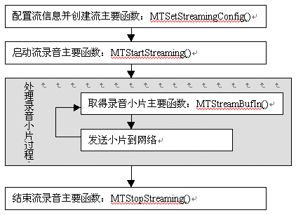 流式錄音的實(shí)現(xiàn)過(guò)程包括配置流信息并創(chuàng)建流、啟動(dòng)流錄音、處理錄音小片及結(jié)束流錄音四個(gè)步驟,如下圖: