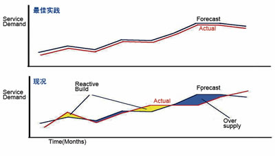 下一代網(wǎng)絡(luò)的IP化、智能化的趨勢,使得服務路徑從靜態(tài)路由為主向動態(tài)化、共享化轉(zhuǎn)變。這種轉(zhuǎn)變使得主動的網(wǎng)絡(luò)容量規(guī)劃在下一代運營環(huán)境中具有更加重要的意義。準確、真實、主動的網(wǎng)絡(luò)容量計劃和趨勢分析能力將成為對OSS解決方案的關(guān)鍵需求。網(wǎng)絡(luò)規(guī)劃不僅可以幫助運營商準確分配網(wǎng)絡(luò)容量,而且可以減少容量不足和失敗訂單,并可通過找出利用率不足的網(wǎng)絡(luò)資源來提高網(wǎng)絡(luò)運行效率,如圖3所示。