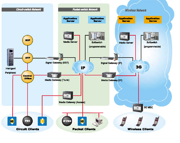 在下一帶網(wǎng)絡(luò)(NGN)中媒體網(wǎng)關(guān)在軟交換(softswitch)的控制下,將一種網(wǎng)絡(luò)中的媒體轉(zhuǎn)換成另一種網(wǎng)絡(luò)所要求的媒體格式。如媒體網(wǎng)關(guān)能夠在電路交換網(wǎng)的承載通道和分組網(wǎng)的媒體流之間進(jìn)行轉(zhuǎn)換,可以處理音頻、視頻或T.120,也具備處理這三者任意組合的能力,并且能夠進(jìn)行全雙工的媒體翻譯,可以演示視頻/音頻消息,實(shí)現(xiàn)其他IVR功能,同時(shí)還可以進(jìn)行媒體會議等。