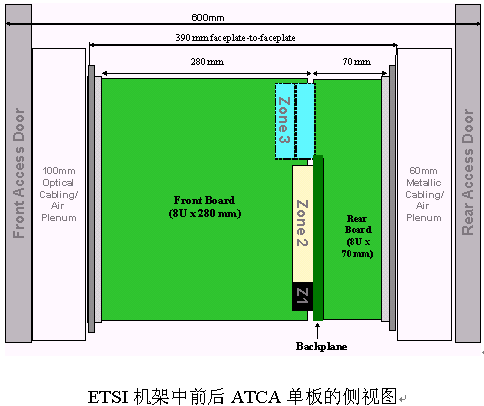 PICMG 3.0機(jī)構(gòu)要求主要來自于對600mm ETSI 和19" EIA標(biāo)準(zhǔn)機(jī)柜空間使用的研究。PICMG 3.0委員會在考慮單板尺寸能支持下一代元器件對物理和散熱的需求的同時,機(jī)箱空間能和板子能達(dá)到最大限度的配合和利用。最初的工作是基于歐規(guī)卡的標(biāo)準(zhǔn),繼而又提升到支持低成本的片狀金屬架構(gòu)(簡單電訊封裝)。對后走線模塊的支持滿足了對后I/O應(yīng)用的需求。在決定可以使用的單板空間時,也充分考慮了前、后板的進(jìn)深范圍以供大量電纜束綁空間。經(jīng)過對不同規(guī)格尺寸的單板的優(yōu)點進(jìn)行討論之后,PICMG 3.0組織統(tǒng)一規(guī)格如下:前板 8U x 280mm,進(jìn)深1.2" pitch,選配后板8U x 70mm深;1.2" pitch,19" EIA機(jī)框可以支持14槽,而600mm ETSI的機(jī)框可以支持16槽。下圖所示為600mm ETSI機(jī)架中的ACTA前后單板的側(cè)視圖: