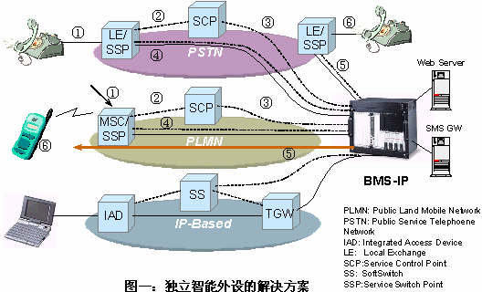 隨著智能業(yè)務(wù)的發(fā)展,智能網(wǎng)中獨(dú)立智能外設(shè)(IIP)的應(yīng)用越來越廣,其功能也得到了很大的增強(qiáng),如:增加了部分業(yè)務(wù)邏輯功能以擴(kuò)展SCP的業(yè)務(wù)邏輯、主動(dòng)呼出功能、業(yè)務(wù)和用戶數(shù)據(jù)存儲(chǔ)管理功能,開放接口等。這種增強(qiáng)型IIP能滿足復(fù)雜的增值業(yè)務(wù)需要,提供有效的業(yè)務(wù)控制和網(wǎng)絡(luò)資源利用,代表當(dāng)前應(yīng)用的主流,已在一些業(yè)務(wù)中有了出色的表現(xiàn)。圖一是采用增強(qiáng)型IIP作為BMS平臺(tái)的原理圖。