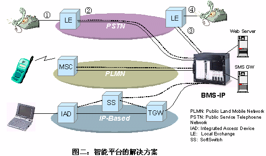 隨著通信發(fā)展,用戶對(duì)業(yè)務(wù)的多樣性、個(gè)性化和智能化的需求愈發(fā)緊迫。因此一種新業(yè)務(wù)在投入市場(chǎng)的時(shí)間,業(yè)務(wù)量和對(duì)現(xiàn)網(wǎng)設(shè)備改造等方面都提出了新的挑戰(zhàn)。智能業(yè)務(wù)平臺(tái)以分布接入、集中控制、業(yè)務(wù)擴(kuò)展靈活,可快速實(shí)現(xiàn)各類電信增值新業(yè)務(wù)的突出優(yōu)點(diǎn),滿足了人們對(duì)電信新業(yè)務(wù)的迫切需要。智能業(yè)務(wù)平臺(tái)投資小、見效快,是近年來實(shí)現(xiàn)增值業(yè)務(wù)的優(yōu)選方案。在固定和移動(dòng)、電信和IT融合的發(fā)展潮流中,它具有很大的想象空間。用智能業(yè)務(wù)平臺(tái)實(shí)現(xiàn)BMS的工作原理如圖二所示。