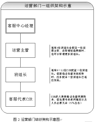 關(guān)于團(tuán)隊(duì)的建設(shè),應(yīng)該首先考慮組織架構(gòu)的設(shè)立。從運(yùn)營角度講,設(shè)置客服中心經(jīng)理、運(yùn)營主管、班組長、客服代表都是必須的。當(dāng)然根據(jù)不同的規(guī)模,也可以增加或者減少層級。具體建議請見圖2所示。除了運(yùn)營之外,對于大型呼叫中心(50坐席以上,或者業(yè)務(wù)較為復(fù)雜的),也應(yīng)考慮相關(guān)部門的設(shè)立。比如客戶關(guān)注組,可以負(fù)責(zé)疑難問題解決、工單流轉(zhuǎn)、投訴處理、建議處理、知識庫建設(shè)采編等等;培訓(xùn)組可以負(fù)責(zé)管理、組織、實(shí)施員工培訓(xùn);技術(shù)維護(hù)組可以負(fù)責(zé)系統(tǒng)維護(hù)、網(wǎng)絡(luò)維護(hù)、新項(xiàng)目應(yīng)用界面開發(fā)、部分系統(tǒng)優(yōu)化;綜合行政可以負(fù)責(zé)人事、行政等事務(wù)。