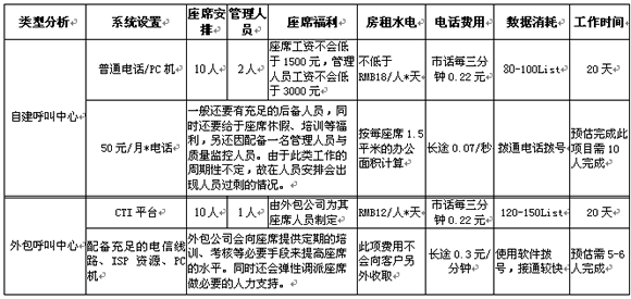 以上是以Telemarkering項(xiàng)目舉例,如需完成一萬(wàn)條數(shù)據(jù)的外呼工作,自建呼叫中心與外包型呼叫中心的區(qū)別。以上數(shù)字只是提現(xiàn)在設(shè)備、人員效率等方面問題,另定期的人員培訓(xùn)及相關(guān)系統(tǒng)的維護(hù)將是費(fèi)用產(chǎn)生的一大因素。其實(shí)在項(xiàng)目的實(shí)施過程中發(fā)生的費(fèi)用只是一部分,從公司的運(yùn)營(yíng)角度看是可以節(jié)省很大的精力(例如:人員招聘、培訓(xùn)、福利待遇)及運(yùn)營(yíng)時(shí)間。