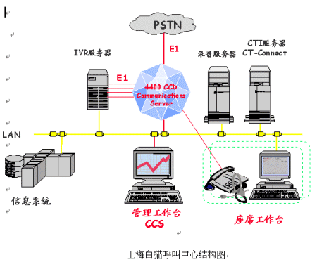 隨著企業(yè)間相互競(jìng)爭(zhēng)的加劇,用戶對(duì)企業(yè)服務(wù)要求的提高,越來(lái)越多的企業(yè)承諾為用戶提供一個(gè)24小時(shí)的客戶服務(wù)環(huán)境,用戶可以隨時(shí)獲得聲音、文字、文件等服務(wù)。而呼叫中心可為企業(yè)解決這些問(wèn)題。阿爾卡特作為著名的企業(yè)通信產(chǎn)品供應(yīng)商,可以為企業(yè)提供一套完整的多媒體呼叫中心平臺(tái)解決方案。上海白貓有限公司是國(guó)內(nèi)著名的洗滌系列產(chǎn)品供應(yīng)商,提供多種渠道為分銷(xiāo)商和用戶提供產(chǎn)品和服務(wù)。面對(duì)競(jìng)爭(zhēng)對(duì)手,面對(duì)客戶的要求,上海白貓決定建設(shè)電子商務(wù)平臺(tái),通過(guò)電話、傳真、郵件、網(wǎng)站各種接入手段,結(jié)合公司的物流系統(tǒng),倉(cāng)庫(kù)管理,網(wǎng)站系統(tǒng),建立客戶關(guān)系管理,經(jīng)營(yíng)策略分析。從而鞏固其在同行業(yè)的地位,獲得更大的競(jìng)爭(zhēng)力。阿爾卡特為上海白貓有限公司提供OmniPCX 4400交換機(jī)解決方案。采用CCD排隊(duì)軟件,采用CCS呼叫管理軟件。CTI中間件采用CT-Connect。