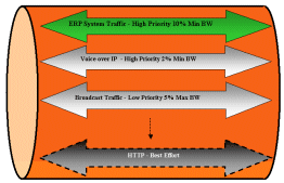 在上例中,在一個千兆端口上,為關(guān)鍵性應(yīng)用ERP預(yù)留了嚴(yán)格的10%的帶寬資源;為Voice Over IP的應(yīng)用預(yù)留了嚴(yán)格的2%的帶寬資源;為低優(yōu)先級的廣播流量預(yù)留了最大5%的帶寬資源,……….為HTTP應(yīng)用僅定義為最為普通的Best Effort。