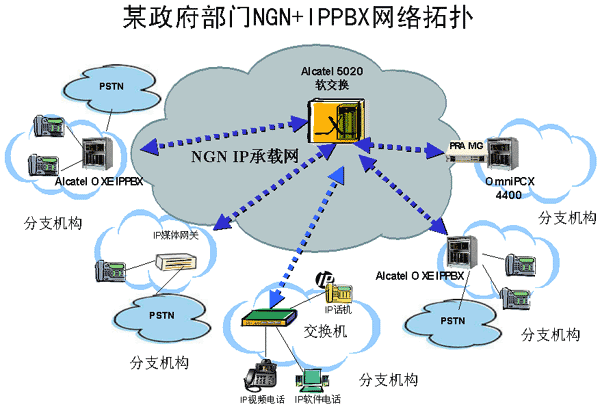 上海貝爾阿爾卡特提出的用NGN整合IP PBX的解決方案,在政府、郵政、酒店、跨國企業(yè)等領域得到了很多成功的應用,下面以國家政府某部門的部署方案為例來詳細介紹NGN+IP