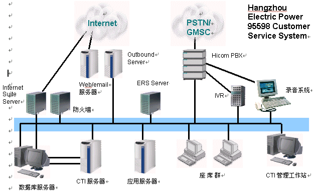 西門子Hicom 350E,作為杭州電力"95598"客服系統(tǒng)的通信服務(wù)器,以其出色的品質(zhì)和強(qiáng)大的功能保證了整個(gè)系統(tǒng)的正常運(yùn)行。同時(shí)充分利用杭州電力局原有的通訊線路,創(chuàng)新性的在原有的SDH(同步數(shù)字體系)網(wǎng)絡(luò)上利用HiPath HG 3200遠(yuǎn)端模塊,將中心的人工坐席延伸到了五個(gè)郊縣電力公司,真正解決了全市統(tǒng)一接入,一個(gè)號(hào)碼對外,業(yè)務(wù)本地受理的問題;同時(shí)遠(yuǎn)端坐席的工作方式真正做到和中心完全一致,給使用、管理、培訓(xùn)等帶來極大的便利。
