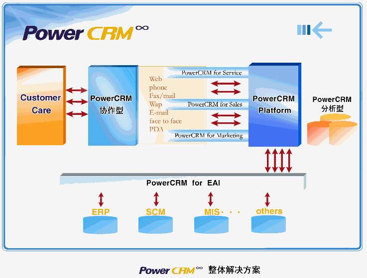 創(chuàng)智集團(tuán)投入巨資,推出的PowerCRM是一套完全基于WEB方案的企業(yè)級的客戶關(guān)系管理應(yīng)用系統(tǒng)。是中國第一款自主開發(fā)的具有大容量數(shù)據(jù)處理能力,具有大型系統(tǒng)定制能力,針對中高端用戶、大型企業(yè)(通信行業(yè)、金融、證券、保險行業(yè)、制造業(yè)、零售業(yè)、服務(wù)行業(yè)、顧問咨詢行業(yè)、IT行業(yè)等)解決方案,是國家計委高技術(shù)產(chǎn)業(yè)化示范工程。盡管已有不少國內(nèi)軟件廠商紛紛推出自己的CRM,但僅停留在“入門級”水平,只能為中小企業(yè)提供傳統(tǒng)的、以運營型為主的CRM解決方案,雖然也可以幫助企業(yè)用戶處理好客戶關(guān)系,提高工作效率,但難以帶來贏利。PowerCRM將自己主要的競爭對手定位于Siebel, Oracle等知名的國際級公司的產(chǎn)品。同過不斷地優(yōu)化產(chǎn)品設(shè)計,爭取奉獻(xiàn)給國內(nèi)企業(yè)客戶功能最強(qiáng)大,性能價格比最高,最符合中國企業(yè)特色的CRM產(chǎn)品。