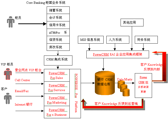 利用PowerCRM的銀行分析型CRM解決方案,對客戶信息進(jìn)行全面的分析,從而挖掘出許多客戶知識,繼而制定和改進(jìn)相應(yīng)的市場策略,應(yīng)用于PowerCRM運營型CRM系統(tǒng)中,更好地指導(dǎo)營銷人員為客戶服務(wù)和完善客戶服務(wù)流程;同時也需要反饋到銀行內(nèi)部系統(tǒng),用于增強(qiáng)銀行內(nèi)部的運營效率。