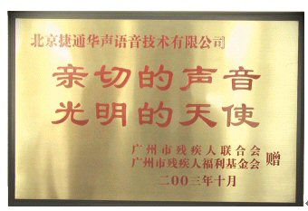 近日,廣州殘疾人聯(lián)合會(huì)授予了北京捷通華聲語音技術(shù)有限公司"親切的聲音,光明的天使"榮譽(yù)稱號(hào),并頒發(fā)了金匾和榮譽(yù)證書,感謝捷通華聲為廣州的社會(huì)福利事業(yè)的近10萬元的捐獻(xiàn)與長(zhǎng)期的技術(shù)支持。
