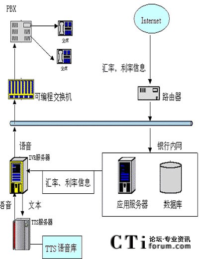 銀行可從網(wǎng)上下載匯率信息或利率信息,之后將這些信息的文本傳遞給IVR服務(wù)器,IVR會(huì)通過調(diào)用TTS服務(wù)器得到這些信息的語音流,之后就可以在坐席上播放這些匯率或利率的語音了。