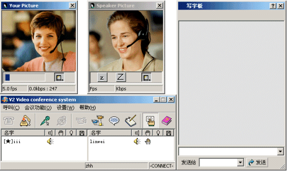 I P視頻會議,是一種利用普通的PC機加上簡單的視頻攝像頭和耳機麥克風,通過Internet或者是局域網進行傳輸,以低廉的成本傳送數據、視頻和音頻信號的新型會議方式。V2公司的視頻會議產品V2 Conference 就采用了這種技術先進而且經濟合算的方式,與傳統的需要專用的服務器和硬件支持的視頻會議相比,該系統可以使您無需進行成本高昂的投入,就實現高質量、高可靠性的音視頻通訊。同時,為了方便您的管理,V2 Conference提供了會議管理的功能,使您足不出戶,就可以掌控全局。