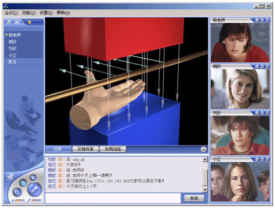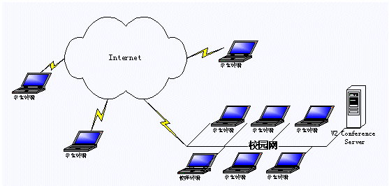 應(yīng)用V2 遠(yuǎn)程教育平臺,教學(xué)和遠(yuǎn)程培訓(xùn)都可以在線進(jìn)行。學(xué)生和教師利用各自的客戶端通過網(wǎng)絡(luò),進(jìn)入一個虛擬課堂,在教師與學(xué)生、學(xué)生與學(xué)生之間建立起語音和視頻的雙向交流、課件教學(xué)、在線會話和白板溝通的環(huán)境,實(shí)現(xiàn)教學(xué)功能。