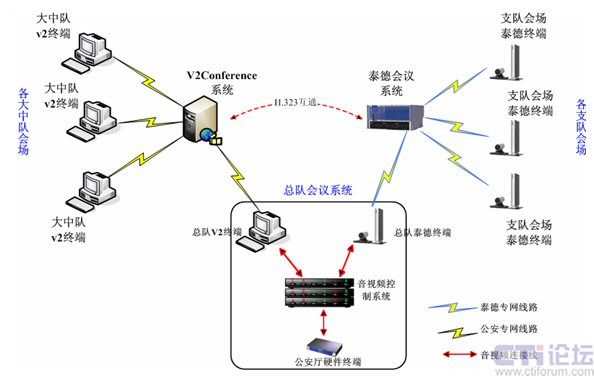 另外在廣東省消防信息系統(tǒng)內(nèi),現(xiàn)有硬件泰德電視電話會(huì)議系統(tǒng)共有23個(gè)終端節(jié)點(diǎn),主要基于獨(dú)立的IP專用網(wǎng)絡(luò),并與V2conference系統(tǒng)所在IP網(wǎng)絡(luò)相互獨(dú)立。為了達(dá)到和硬件系統(tǒng)共用互通,實(shí)現(xiàn)全網(wǎng)會(huì)議互通,在總隊(duì)會(huì)議系統(tǒng)中,將會(huì)議系統(tǒng)一級網(wǎng)(省公安廳——消防總隊(duì))、二級網(wǎng)(消防總隊(duì)——支隊(duì))、三級網(wǎng)(消防支隊(duì)——消防大中隊(duì))通過消防總隊(duì)會(huì)議控制系統(tǒng)和v2conference系統(tǒng)自帶的H.323互通功能模塊融合到一起。