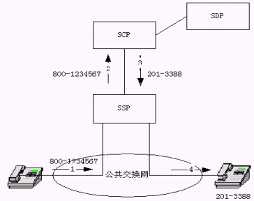 該圖示業(yè)務(wù)工作過程如下:(1)主叫用戶撥800號(hào)號(hào)碼,(2)SSP向SCP查詢800號(hào)號(hào)碼,(3)SCP查詢數(shù)據(jù)庫(kù)后向SSP送回譯碼結(jié)果(真正被叫號(hào)碼),(4)SSP連接主、被叫,振鈴。