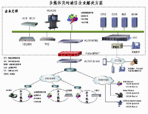 VCON提供了以HD系列的視頻終端產(chǎn)品和以VCB系列的多點(diǎn)控制單元(MCU)產(chǎn)品來構(gòu)建基于IP網(wǎng)絡(luò),采用H.323協(xié)議作為標(biāo)準(zhǔn)協(xié)議的視頻通信解決方案。通常主會(huì)場(chǎng)選擇會(huì)議室型終端HD5000,該終端在64Kbit/s下就可以實(shí)現(xiàn)畫面流暢的動(dòng)態(tài)雙流;主會(huì)場(chǎng)也可以選擇機(jī)架式會(huì)議終端HD2000,這樣主會(huì)場(chǎng)可以選配正裝和吊裝攝像機(jī),拍攝會(huì)場(chǎng)不同角度的場(chǎng)景;多點(diǎn)控制單元(MCU)選擇VCB3000,同時(shí)可以為領(lǐng)導(dǎo)、個(gè)人桌面或者出差用戶單獨(dú)配置支持H.323標(biāo)準(zhǔn)的Vpoint HD軟終端,該終端是目前業(yè)界惟一支持H.264、雙流、組播接受以及遠(yuǎn)程控制的軟終端產(chǎn)品。