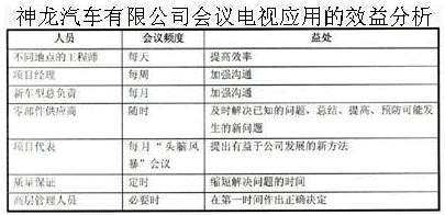 下表通過(guò)對(duì)神龍汽車(chē)有限公司應(yīng)用會(huì)議電視系統(tǒng)的分析,展示了會(huì)議電視虛擬應(yīng)用所帶來(lái)的益處。