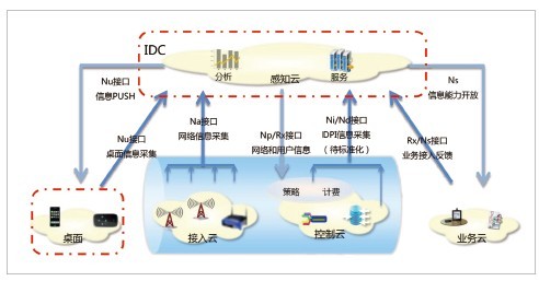 中興通訊增強(qiáng)端到端信息感知和開(kāi)放接口,提出一套標(biāo)準(zhǔn)架構(gòu)如圖2所示,來(lái)實(shí)現(xiàn)整個(gè)網(wǎng)絡(luò)透明、可視。建設(shè)網(wǎng)絡(luò)信息采集體系,增強(qiáng)感知云的端到端分析能力;建立“桌面云-感知云”的云端一體化架構(gòu),提供網(wǎng)絡(luò)推送能力;感知云向終端開(kāi)放網(wǎng)絡(luò)信息和能力,增強(qiáng)用戶感知網(wǎng)絡(luò)、定制個(gè)人體驗(yàn)?zāi)芰Γ桓兄葡驑I(yè)務(wù)開(kāi)放網(wǎng)絡(luò)信息和能力,拓展合作發(fā)展增值業(yè)務(wù)的能力。