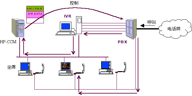在任何一個(gè)步驟中,如客戶選擇了人工坐席,則IVR請求CCM根據(jù)多種情況選擇一個(gè)空閑坐席(選擇方法見下文)并控制PBX將呼叫與選擇的人工坐席接通,同時(shí)系統(tǒng)在客戶對IVR操作的過程中,已經(jīng)幀測到了客戶所使用的電話號碼、客戶的按鍵信息,系統(tǒng)還記錄有客戶上次的呼叫情況等數(shù)據(jù),這些數(shù)據(jù)基本上可以確定客戶大體關(guān)心的問題,對于老客戶甚至可以初步認(rèn)定呼叫者的身份、年齡、性別、業(yè)務(wù)辦理情況等,因此,話務(wù)員在與客戶談話之前就已經(jīng)了解了相當(dāng)多的信息,并控制選定的坐席屏幕顯示有關(guān)客戶信息,便于直接進(jìn)入正題,提高了效率。客戶與坐席的交流過程中,坐席可通過終端請求CCM控制PBX將本次呼叫與其他話務(wù)員(坐席)、專家或業(yè)務(wù)辦公室(如內(nèi)線電話)等接通,當(dāng)坐席人員將呼叫轉(zhuǎn)移到另一坐席或?qū)<視r(shí),系統(tǒng)將在本呼叫中收集的各類數(shù)據(jù)同時(shí)轉(zhuǎn)向下一坐席電腦。在坐席人員解答客戶問題時(shí),可將問題及解答情況收集,便于分析坐席人員的業(yè)務(wù)素質(zhì)和問題傾向,從而有針對性地培訓(xùn)坐席人員。對于客戶來講,他可以通過電話按鍵在話務(wù)員、自動語音、傳真、專家和業(yè)務(wù)辦公室之間漫游,系統(tǒng)將記錄客戶漫游的路徑,對于設(shè)計(jì)較好的菜單和路經(jīng)來說,客戶的漫游路徑基本上可以反映出其需求,大量客戶的漫游路徑無疑將反映出市場需求。