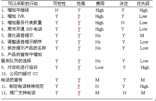 項(xiàng)目小組接下來對(duì)列舉的眾多原因合并、歸類并再次進(jìn)行頭腦風(fēng)暴,并"可控性"、"實(shí)施預(yù)期效果"、"實(shí)施費(fèi)用"、"是否可以由項(xiàng)目小組作決定"、"優(yōu)先級(jí)"等幾個(gè)方面對(duì)可以采取的行動(dòng)進(jìn)行逐項(xiàng)分析(見下圖),最終確定1、5、9、10、11、12項(xiàng)納入到實(shí)施方案,指定相應(yīng)的實(shí)施負(fù)責(zé)人,制定相應(yīng)實(shí)施時(shí)間表,實(shí)施時(shí)長(zhǎng)為三個(gè)月。