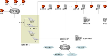系統(tǒng)的核心是話路語音中心,主要實(shí)現(xiàn)兩大功能: 一是實(shí)現(xiàn)180系統(tǒng)的話路語音平臺(tái); 二是實(shí)現(xiàn)與電話網(wǎng)絡(luò)的接口。以1臺(tái)Pentium級(jí)工控機(jī)作為處理平臺(tái),2塊30線數(shù)字中繼語音處理卡,1塊帶振鈴器的24線模擬座席電話轉(zhuǎn)接卡,1塊4路傳真卡,卡間以語音處理行業(yè)的標(biāo)準(zhǔn)總線SC總線相連。系統(tǒng)與電信網(wǎng)絡(luò)的接口采用E1數(shù)字中繼線,信令方式采用中國(guó)一號(hào)信令為隨路信令,工控機(jī)用TCP/IP協(xié)議與局域網(wǎng)相連。