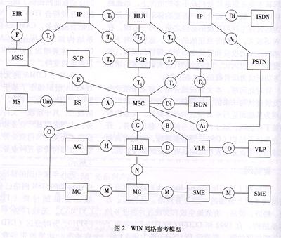 在基于CDMA的無線智能網(wǎng)方面,北美的TIA/EIA組織頒布了基于CS-2的無線智能網(wǎng)規(guī)范WIN。WIN分為三個(gè)階段:階段一、預(yù)付費(fèi)階段和階段二。其中階段一支持的主要業(yè)務(wù)有來話篩選業(yè)務(wù),主叫名字顯示業(yè)務(wù)和語(yǔ)音控制的業(yè)務(wù),預(yù)付費(fèi)階段主要支持預(yù)付費(fèi)業(yè)務(wù),階段二支持被叫集中付費(fèi),立即付費(fèi)等五種業(yè)務(wù)。WIN網(wǎng)絡(luò)參考模型如圖2所示。