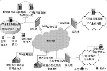 在實(shí)際建立的系統(tǒng)中,采用了公司內(nèi)部3臺(tái)服務(wù)器。一臺(tái)ICC主要用作登錄認(rèn)證及用戶和服務(wù)器管理;2臺(tái)ICS服務(wù)器,一臺(tái)布置在防火區(qū),供外網(wǎng)用戶的訪問(wèn),一臺(tái)在內(nèi)網(wǎng),供公司內(nèi)部員工使用。在公司外面,托管了一臺(tái)ICS(通訊服務(wù)器),供公司外部用戶訪問(wèn)。