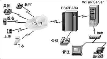 用語音板卡搭建電話會議一般注重在單一的音頻通信。考慮到單純的音頻或視頻會議模式都或多或少有各自的局限性,宇音將數(shù)據(jù)與語音整合在一起,實現(xiàn)音頻/圖文會議。VCTalk各系列電話會議系統(tǒng)采用高性能的語音/會議資源卡作為硬件支持,可實現(xiàn)多方電話會議(≥8),具有多組會議、與會者身份認(rèn)證、設(shè)置會議主持人、邀請與會者、會議通知、會議內(nèi)容同步播放、會議密碼保護(hù)、智能播放、會議內(nèi)容全程錄音/存儲、本地/遠(yuǎn)程查聽會議錄音的功能,并可以對企業(yè)內(nèi)部發(fā)生的呼叫記錄進(jìn)行計費和統(tǒng)計。針對中小企業(yè)辦公靈活的特點,VCTalk系統(tǒng)搭建簡單易行,其結(jié)構(gòu)圖見圖1。