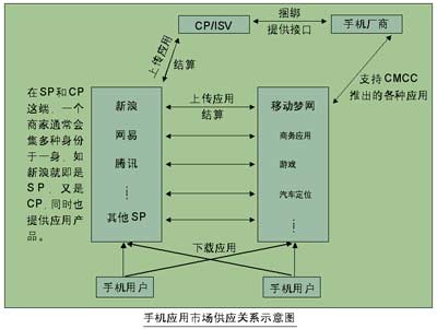 在這樣一個全新的銷售模式下,運營商的作用也越發(fā)凸顯出來。“夢網(wǎng)是一個大的平臺,SP是個小平臺,SP再通過與CP建立合作,進而將整個應(yīng)用市場與終端連接起來。現(xiàn)在,我們?nèi)康膽?yīng)用都放到夢網(wǎng)上面了!北本﹫笸娮由虅(wù)公司的一個工作人員說。移動夢網(wǎng)的建立,事實上在手機廠商、應(yīng)用開發(fā)商、用戶三者之間搭了一個橋梁,將各種手機應(yīng)用集中在一個門戶網(wǎng)站,用戶需要時,只需登陸到夢網(wǎng)上面,點擊相關(guān)的網(wǎng)頁,就可隨時下載所需要的應(yīng)用。