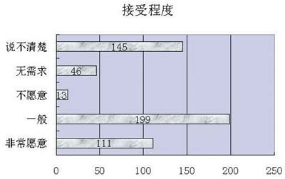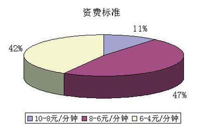 在調(diào)查中,67.4%的用戶對(duì)現(xiàn)有中國電信的資費(fèi)標(biāo)準(zhǔn)(10元/分鐘)表示不滿,32.6%的用戶表示滿意。但同時(shí)58%的用戶對(duì)能接受的資費(fèi)標(biāo)準(zhǔn)上又選擇了居中和較高的資費(fèi)標(biāo)準(zhǔn),表明用戶對(duì)視訊應(yīng)用產(chǎn)品的價(jià)格承受能力較高。